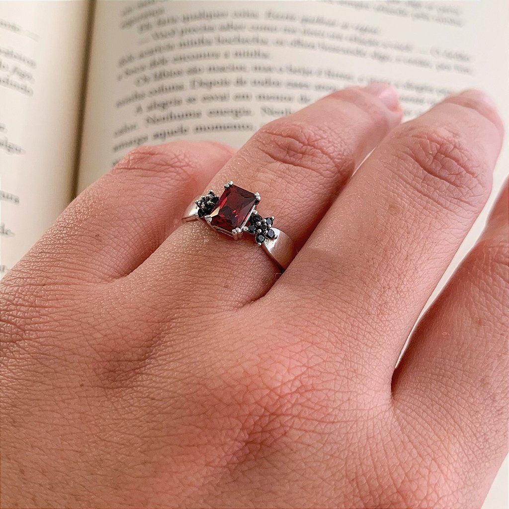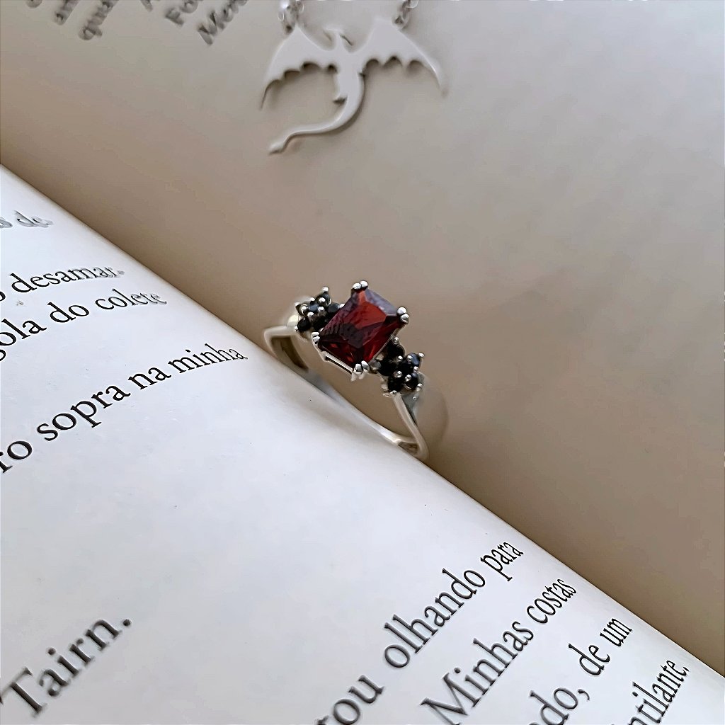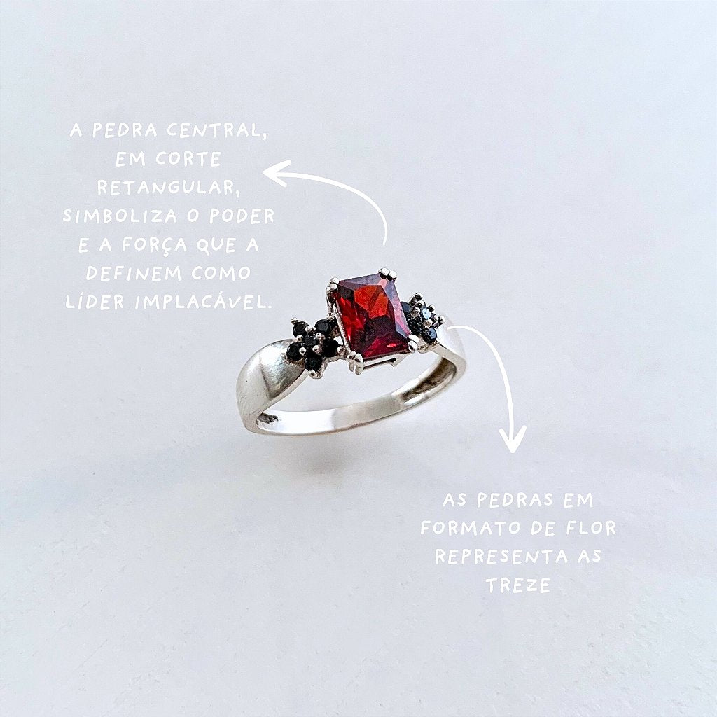 Forjado em prata 950, este anel carrega a essência e a força de uma das personagens mais marcantes de Trono de Vidro. No centro, a pedra granada representa Manon, irradiando lealdade, coragem e liderança. Ao seu redor, as doze pedras negras simbolizam cada uma das bruxas do clã Bico Negro, formando um círculo de irmandade e sacrifício. Mais do que uma joia, é um tributo eterno à união, à bravura e ao legado das Treze.